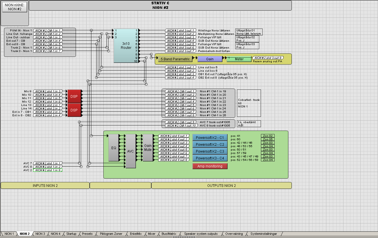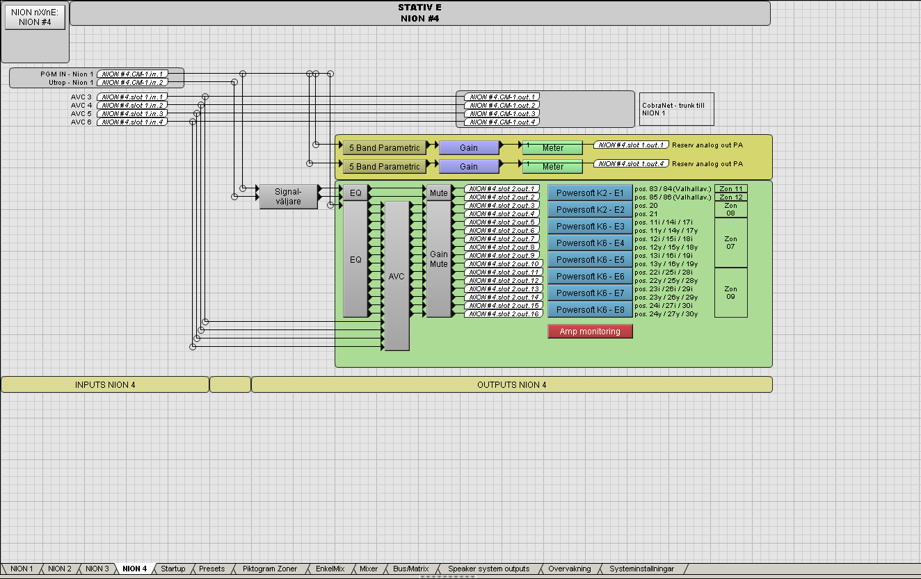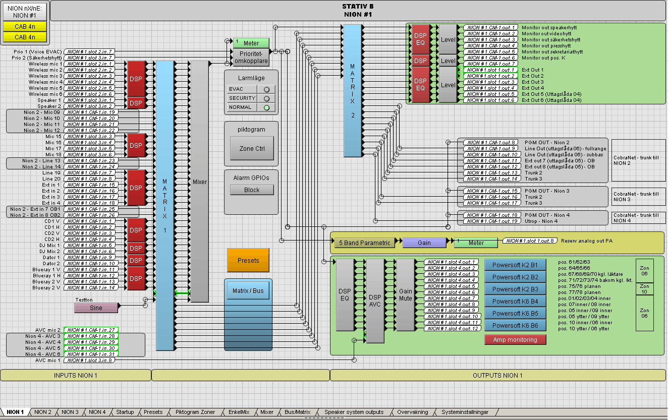 Konfigurationen för alla fyra NION DSP-noder samsas i samma .npa-fil och är uppdelad på fyra flikar/vyer; en för varje nod. ((A+)B, C, D och E).