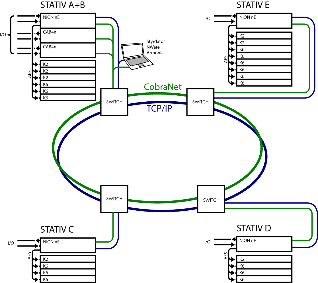 Distributionssystemet bygger på ett redundant fibernät med nodpunkter i fyra stativplaceringar runtom arenan. En Mediamatrix NION nE i varje nod står för DSP, styrning och ljuddistribution till därstädes samgrupperade slutsteg ur Powersofts K-serie. Nätverket är uppdelat i två V-LAN; ett audionät (CobraNet) och ett "vanligt" TCP/IP-nät för styrning. Signaltransporten mellan DSP-noderna och slutsteg går över AES.