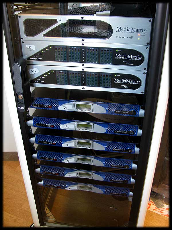 Stativ B med MediaMatrix DSP, Powersoft-slutsteg och nätverksutrustning