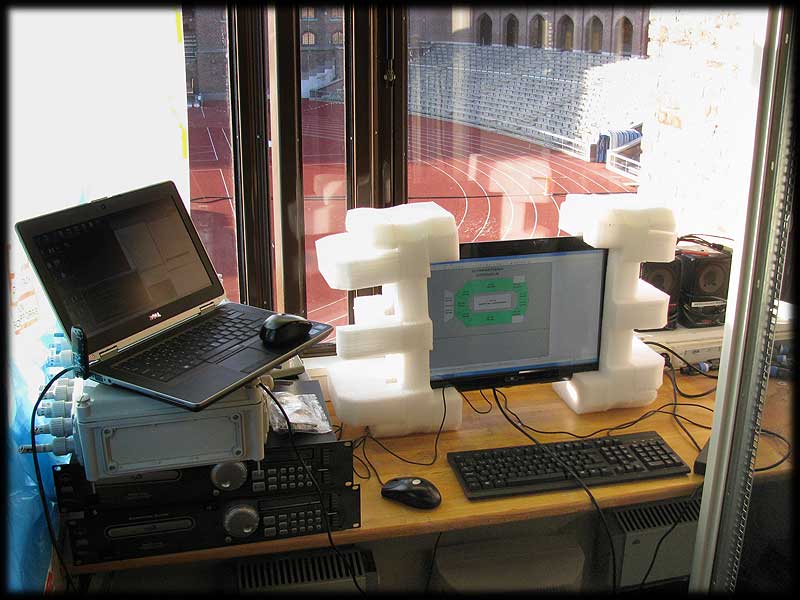 Teknik- och kommentatorshytter. Huvvuddelan av ljudutrustningen och styrpanelen är placerad i hytten ovanför valvet.